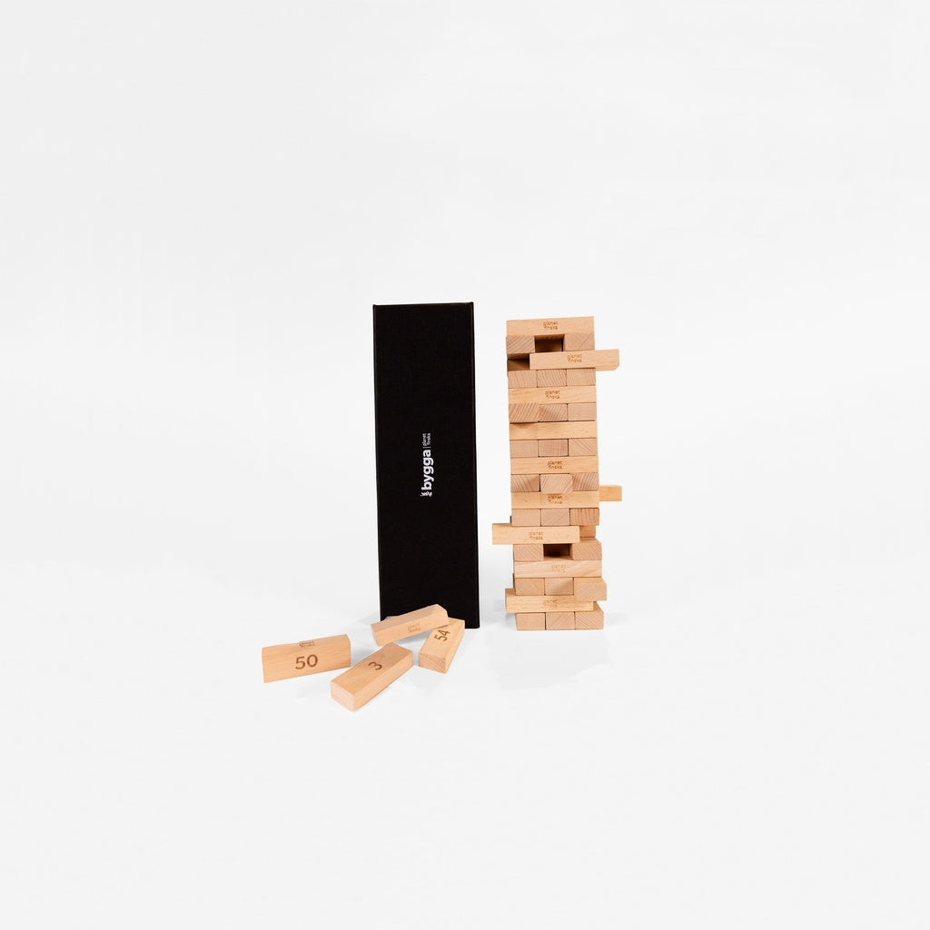Bygga Standard comes with 54 solid beechwood blocks with Planet Finska's added Vaga element. Vaga is Swedish for dare! The blocks are individually numbered 1 - 27, 2 of each number. Players make up 27 dares. Once a player pulls a block from the tower, they must complete the dare that correlates with the number on that block - or face the penalty for incompletion! And of course if dares aren't your thing, you can always continue to play Bygga the classic way we all know and love.